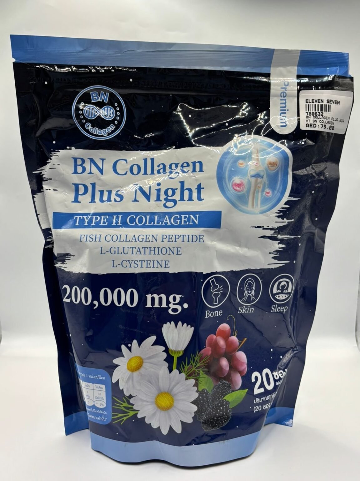 A dietary supplement containing Type II collagen, fish collagen peptide, L-glutathione, and L-cysteine. It is marketed for benefits related to bone health, skin improvement, and better sleep.