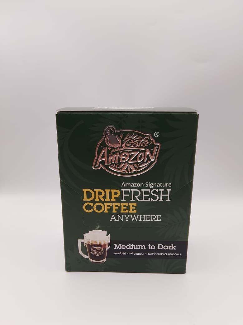 Café Amazon Signature Drip Coffee, a convenient, single-serve coffee product. This Thai coffee is made from 100% roasted and ground coffee beans (a blend of Arabica and Robusta) and is classified as a medium to dark roast.