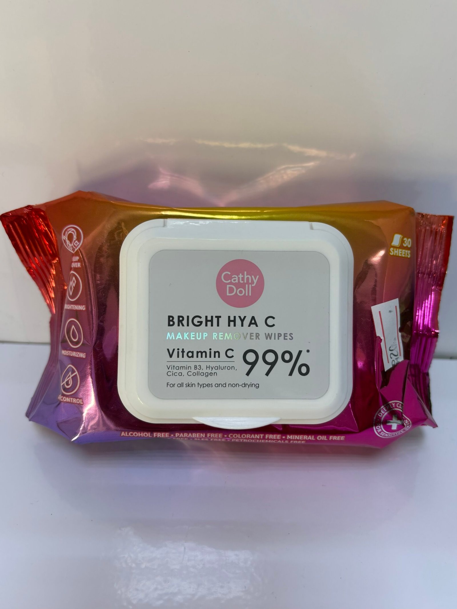 Cathy Doll Bright Hya C Makeup Remover Wipes. These wipes are designed to effortlessly cleanse and remove makeup, excess oil, and impurities.