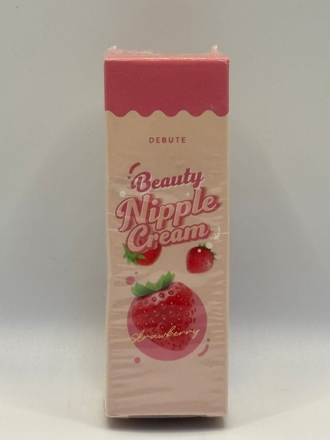 Debute Beauty Nipple Cream, a body care product designed to moisturize and revitalize the skin, particularly on lips and nipples. It is available in different fragrances, including the strawberry variant pictured.