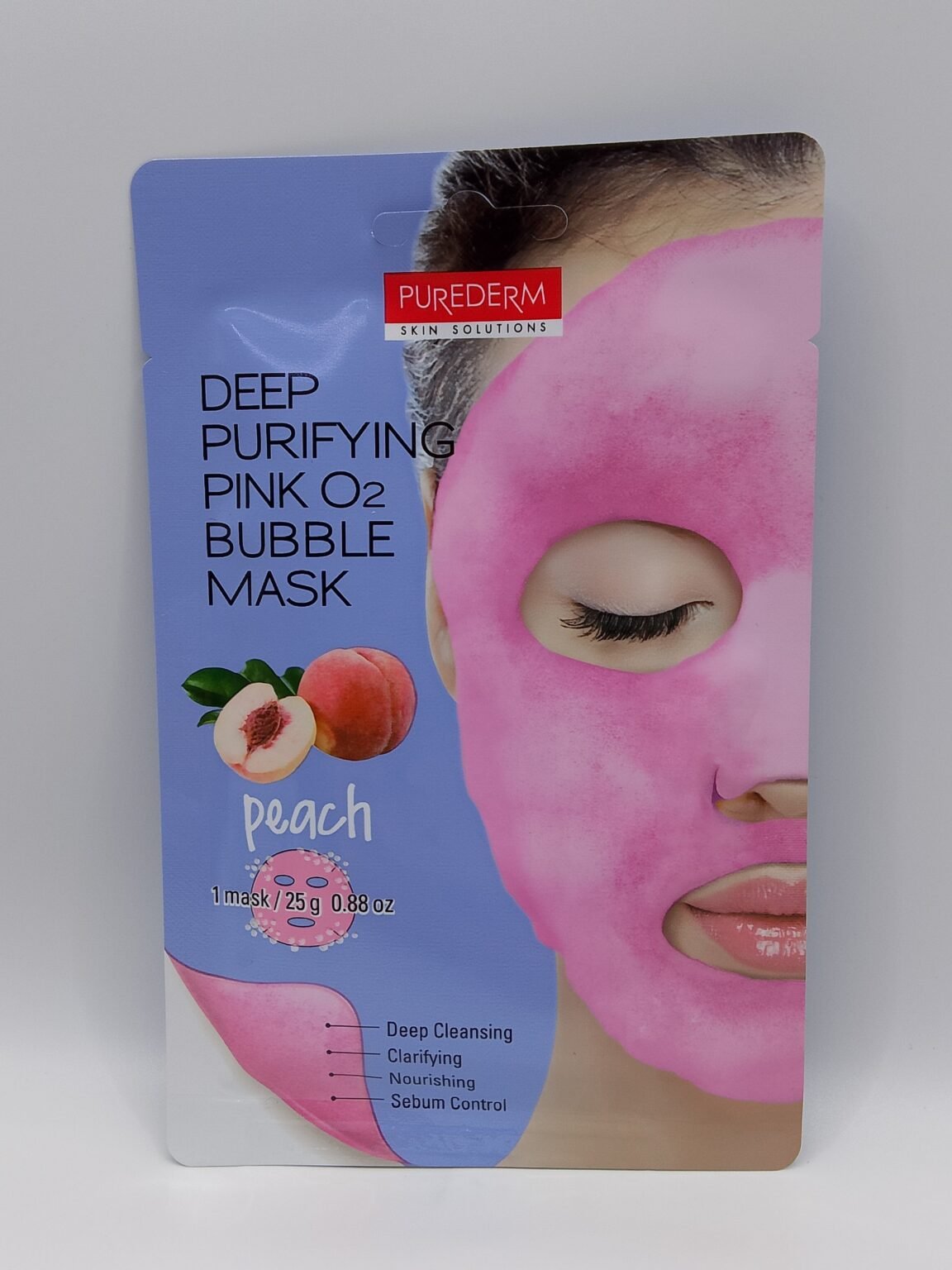 Purederm Deep Purifying PinkO2 Bubble Mask with Peach extract. This is a wash-off type sheet mask that generates abundant oxygen bubbles to deeply cleanse and clarify the skin.