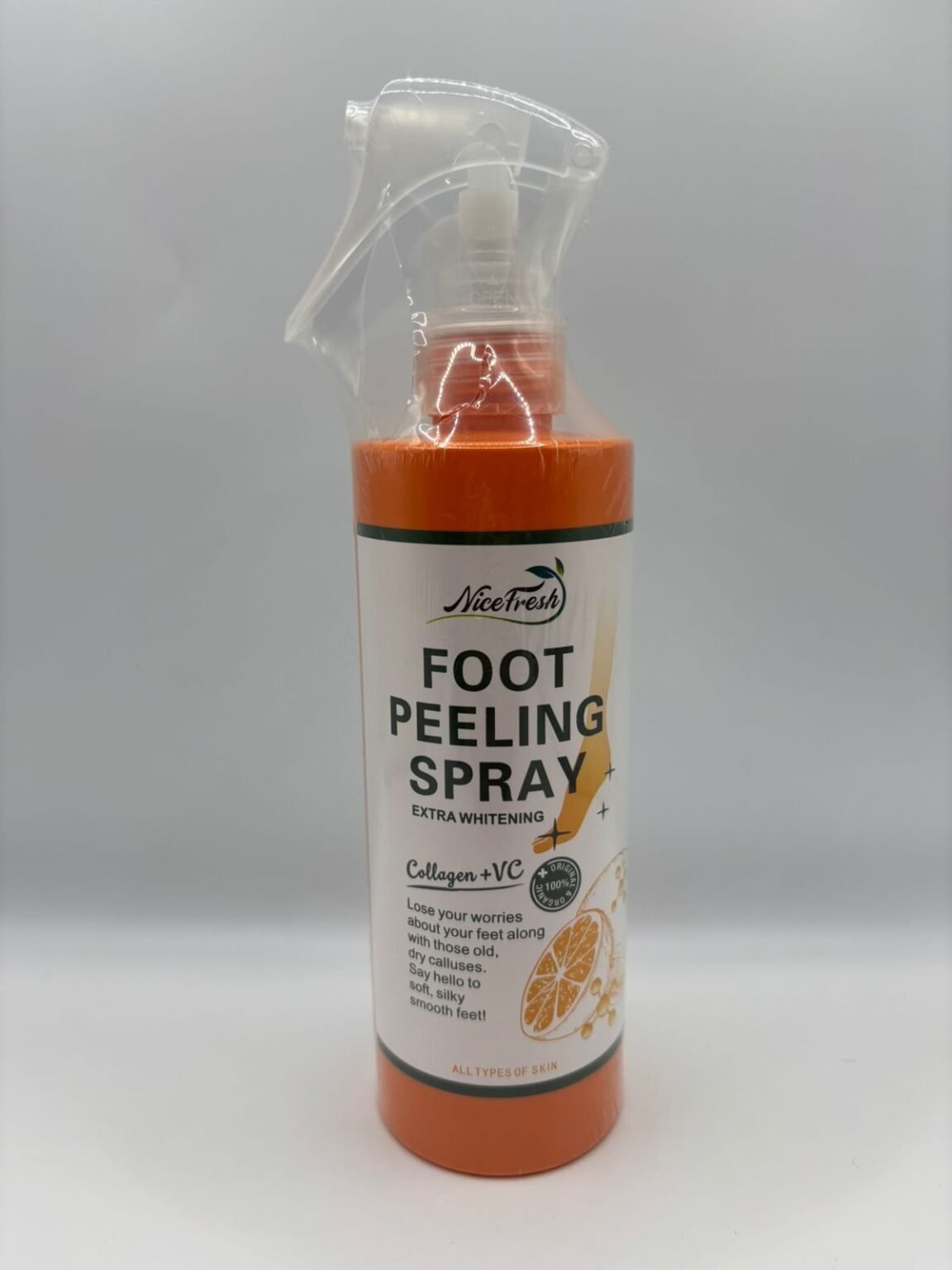 Foot Peeling Spray (specifically branded as “Nice Fresh” in the image, similar to “Foot-Medi” products). It is designed for body care, specifically for feet, to remove dead skin and soften calluses.