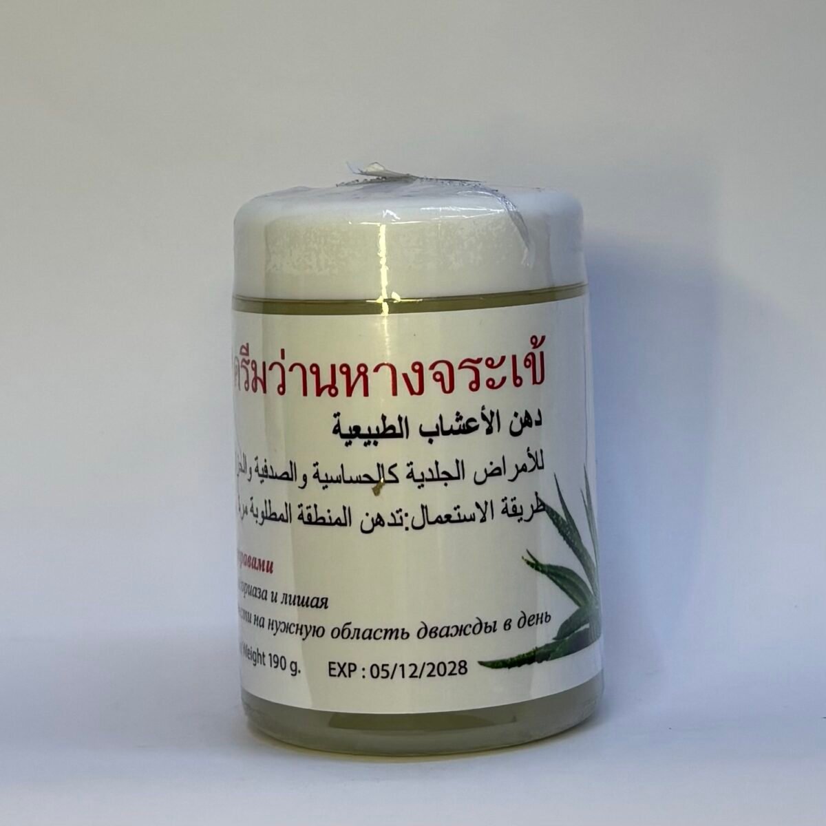 Intended for various skin conditions, such as sensitivity and dryness. It is described in Arabic as a “natural herbal ointment” for “skin diseases”. The Thai text also mentions “ว่านหางจระเข้” which means aloe vera.