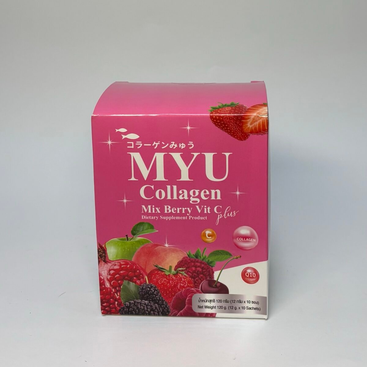 MYU Collagen Mix Berry Vit C Plus, a dietary supplement product. It is a mixed berry flavored powder supplement containing collagen and vitamin C, to support healthy, glowing skin and provide potential anti-aging benefits.