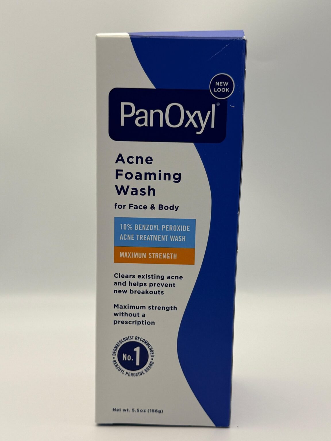 PanOxyl Acne Foaming Wash, a maximum strength, fast-acting wash for the face and body that contains 10% Benzoyl Peroxide. It is designed to clear existing acne, unclog pores, and help prevent new breakouts from forming by killing acne-causing bacteria.