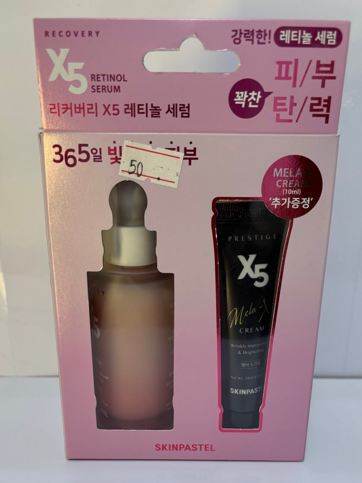 Product Type: The set appears to include a serum and potentially a complementary cream or ampoule, as indicated by the “Mela Cre” label on the smaller item.
