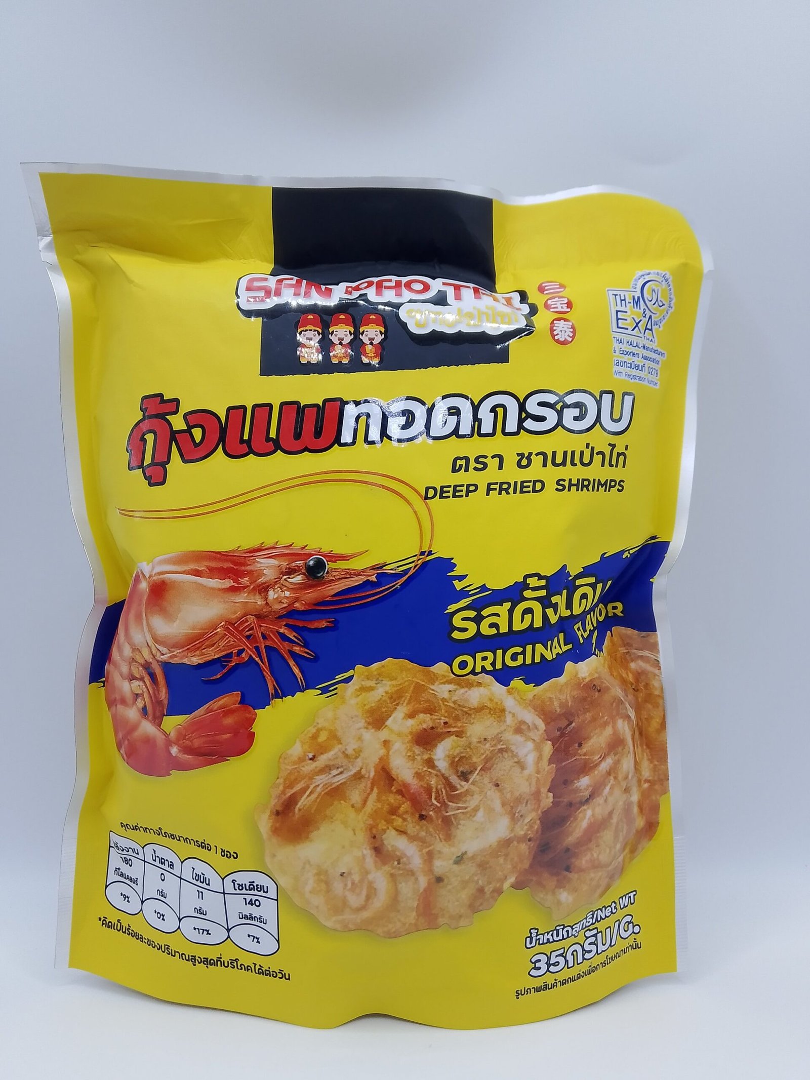 San Pao Tai Deep Fried Shrimps snack, an original flavor crispy shrimp snack from Thailand.
