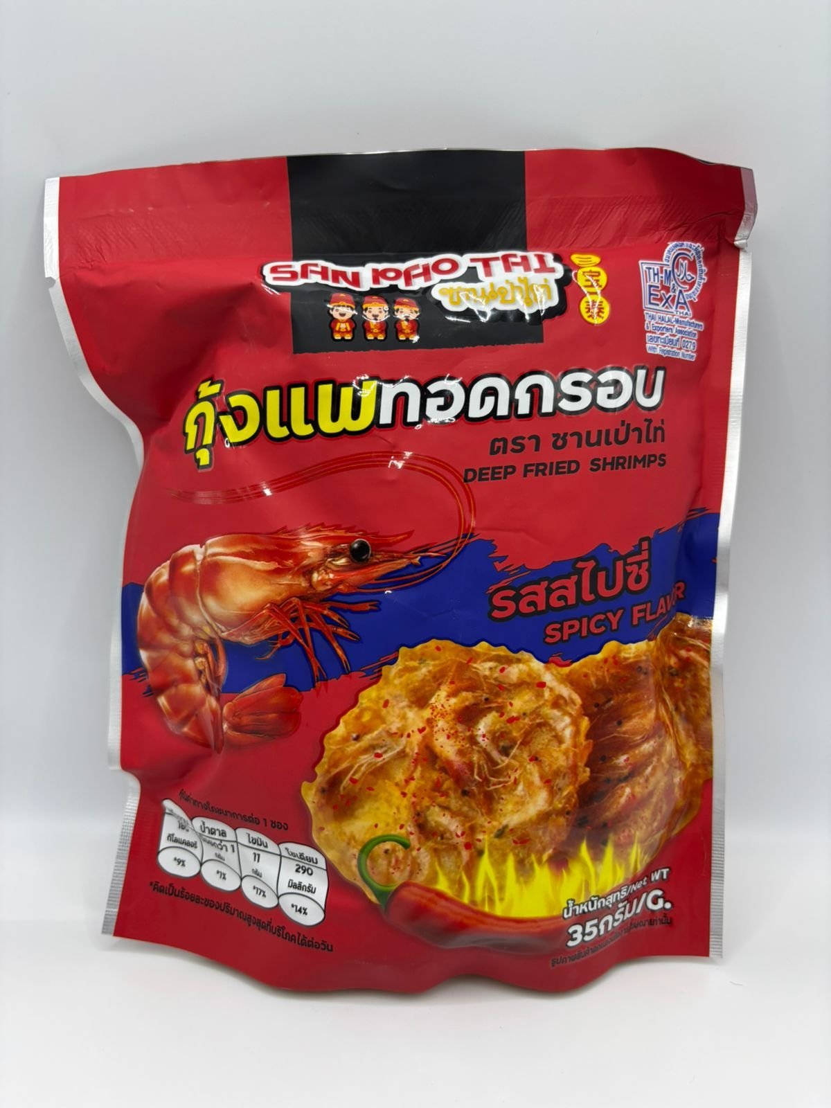 San Pao Tai Deep Fried Shrimps snack, an Spicy flavor crispy shrimp snack from Thailand.