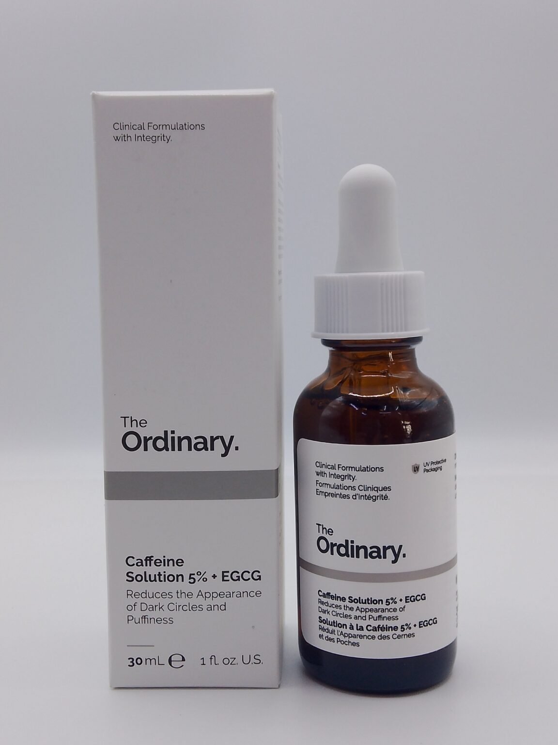 The Ordinary Caffeine Solution 5% + EGCG, a water-based eye serum designed to address concerns around the delicate eye area. It contains a high concentration of 5% caffeine, supplemented with Epigallocatechin Gallatyl Glucoside (EGCG) derived from green tea leaves.