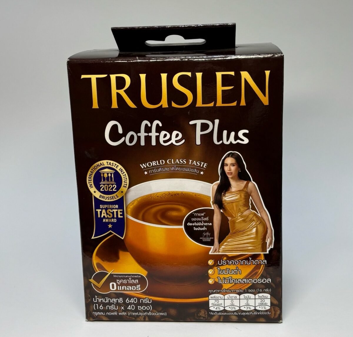 Truslen Coffee Plus, a sugar-free instant coffee mix that is enhanced with functional ingredients such as L-carnitine, L-glutamine, L-arginine, and sometimes collagen, designed as a healthier coffee option. It is often marketed to support weight management and skin health.